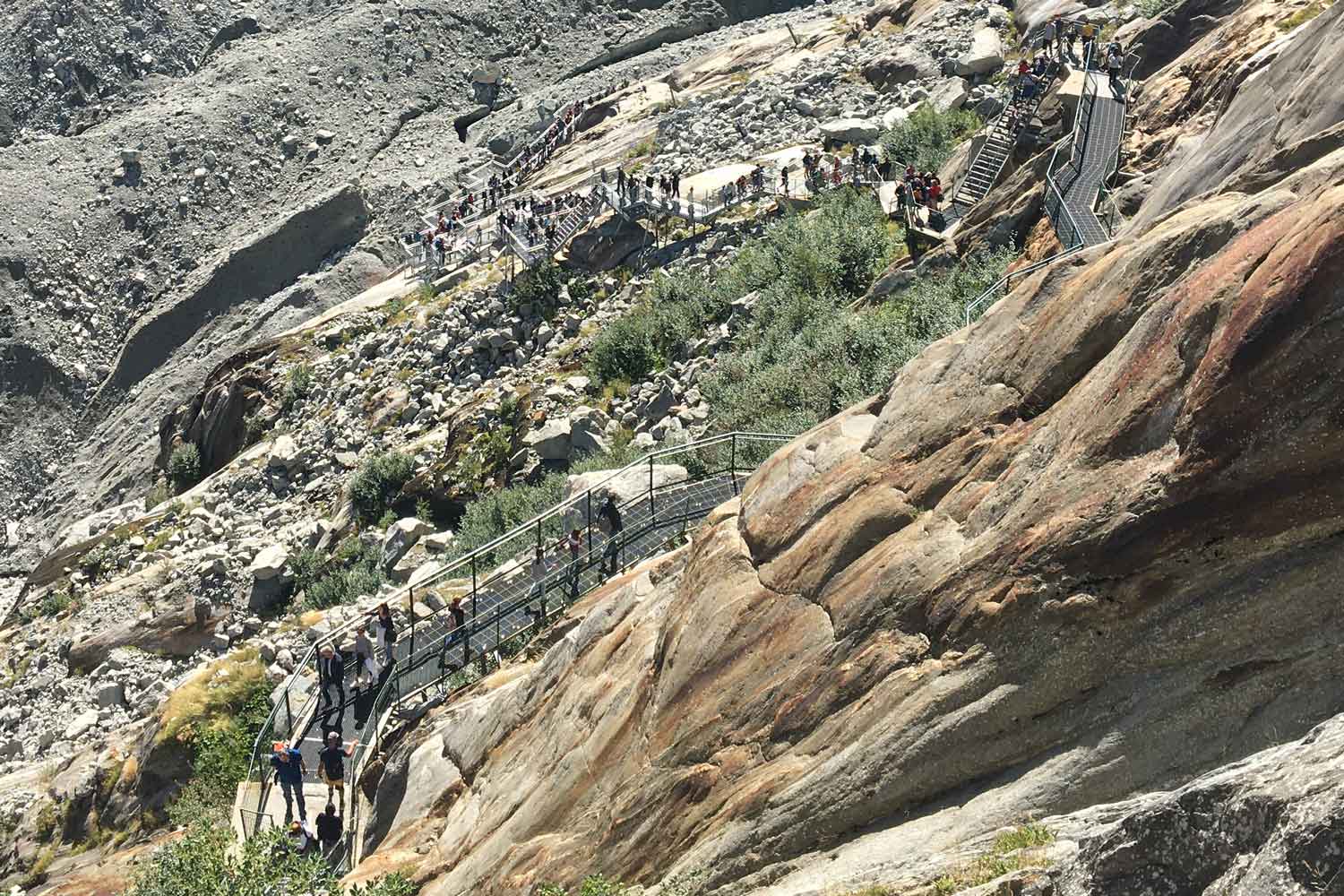 Cover photo for Mountain Research and Development, Volume 46, Number 1, taken by Jean Miczka. Looking down a rocky slope toward the Mer de Glace glacier, we see numerous people walking on metal stairs and bridges connecting our vantage point to the glacier. This infrastructure is needed to keep the glacier accessible to tourists as it melts and exposes more and more steep rock.