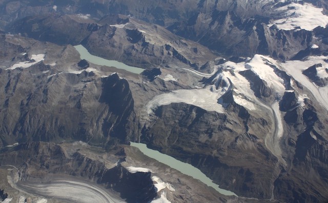 Cover image: Several glaciers stem in a star shape from the summit of “Mont Blanc de Cheilon” (3,870m ASL) in the upper-right of the photograph, which is part of the Pennine Alps in Switzerland on the border with Italy. This mountain area is located above the Rhône Valley further downstream. It was captured at the height of the summer from a commercial flight at around 20,000ft when the glaciers are most exposed. The large glacial-fed reservoirs of “Lac des Dix” (upper) and “Lac de Mauvoisin” (lower) in the “Canton of Valais” are clearly visible [photograph by Ahmed Shams, 30 August 2011].
