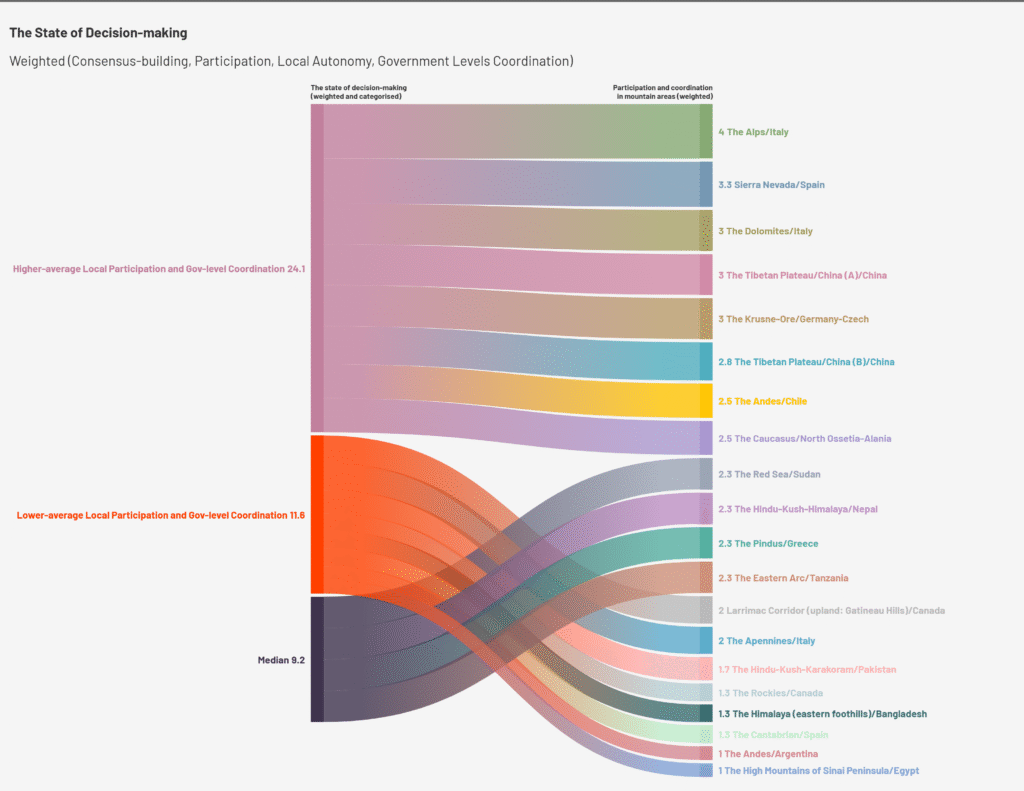 Mountain areas with the highest weighted scores across all 50 instruments also rank highest on the state of decision making. These include areas in the Italian Alps and Dolomites (vs. the Apennines), the Spanish Sierra Nevada, Chinese Tibet, the German-Czech Krusne-Ore range, Chilean Andes, and the Caucasian North Ossetia-Alania.