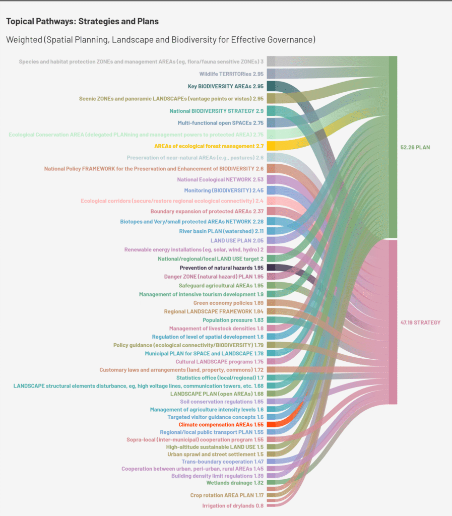 Figure 2. Agendas, strategies, frameworks, and agreements Verses spatial planning, landscape, and biodiversity instruments (each topic is classified into plan or strategy and then weighted across all mountain areas). MRI MGWG survey 2025.