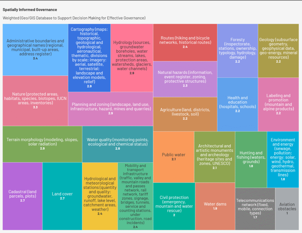 Figure 3. The availability of the geo/GIS databases — data layers — to support spatially informed mountain governance (each data layer is weighted according to its effectiveness level score across all mountain areas). MRI MGWG survey 2025.